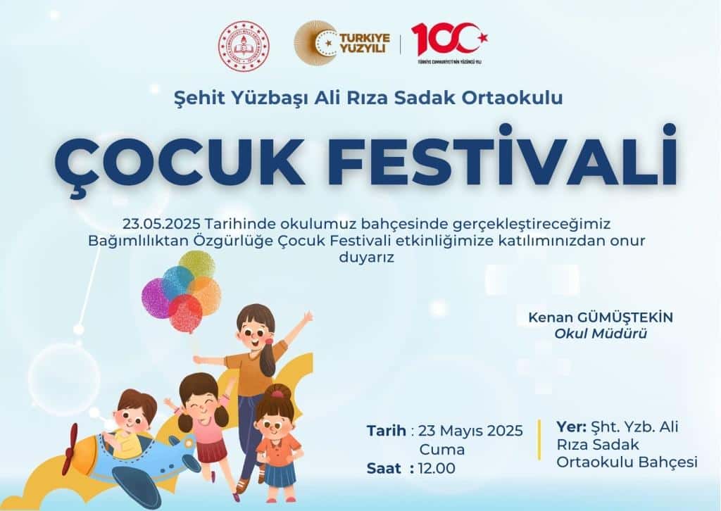 23.05.2025 Cuma günü saat 12:00'de okulumuz bahçesinde Çocuk Festivali düzenlenecektir. Festivalimizin bu yılki teması "Bağımlılıklarla Mücadele" olarak belirlenmiştir. Festival kapsamında öğrencilerimizin hazırladığı bağımlılık konulu resim ve afiş sergisi, müzik dinletisi, özlü sözler dinletisi, ekrandan uzak çocuk yarışları, pano sunumları ve kermes yapılacaktır. Tüm velilerimiz ve öğrencilerimiz davetlidir
